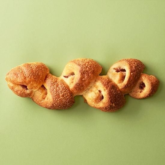 ベーコンエピの形は麦の穂を模しており、エピ(epi)はフランス語で「麦の穂」の意味。ベーコンを入れて焼くので「ベーコンエピ」といいます。細長く成形したパン生地をハサミでカットして、生地を互い違いにずらしてして焼くことで、麦の穂の形になります。