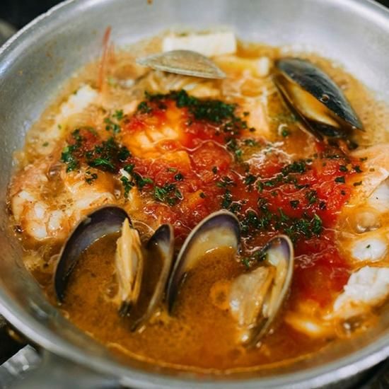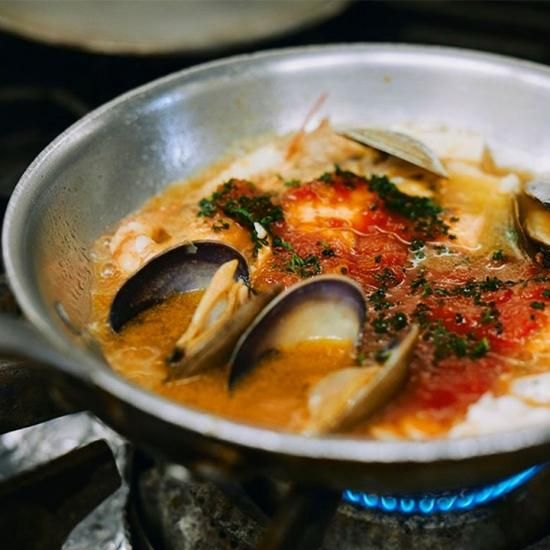 お刺身用として食べられる鮮度抜群の産直魚介を惜しみなく使った旨みたっぷりのトマトソースベース。九州や四国などを中心に旬のサーモンやブリ、鯛、イカ、アサリなどと、市場直送、ムール貝(チリ産)、赤海老(アルゼンチン)。