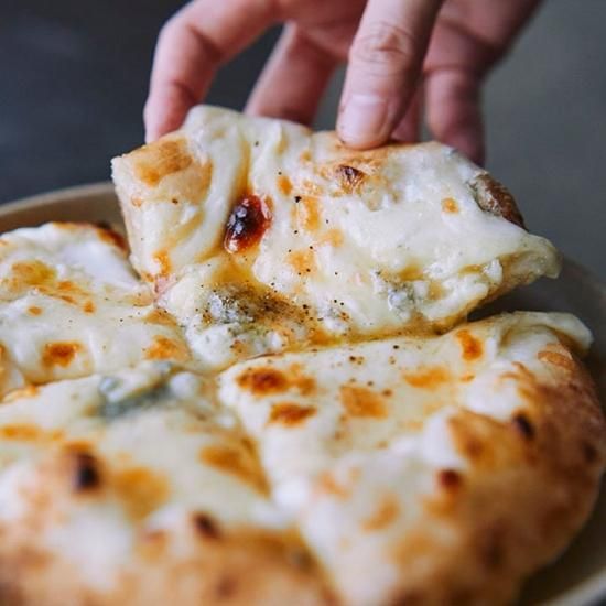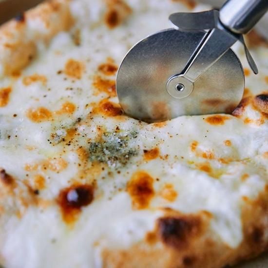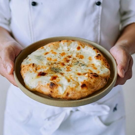 クリームチーズ、モッツァレラチーズ、ゴルゴンゾーラチーズ、パルミジャーノレッジャーノの4種類を使用したチーズのピザ